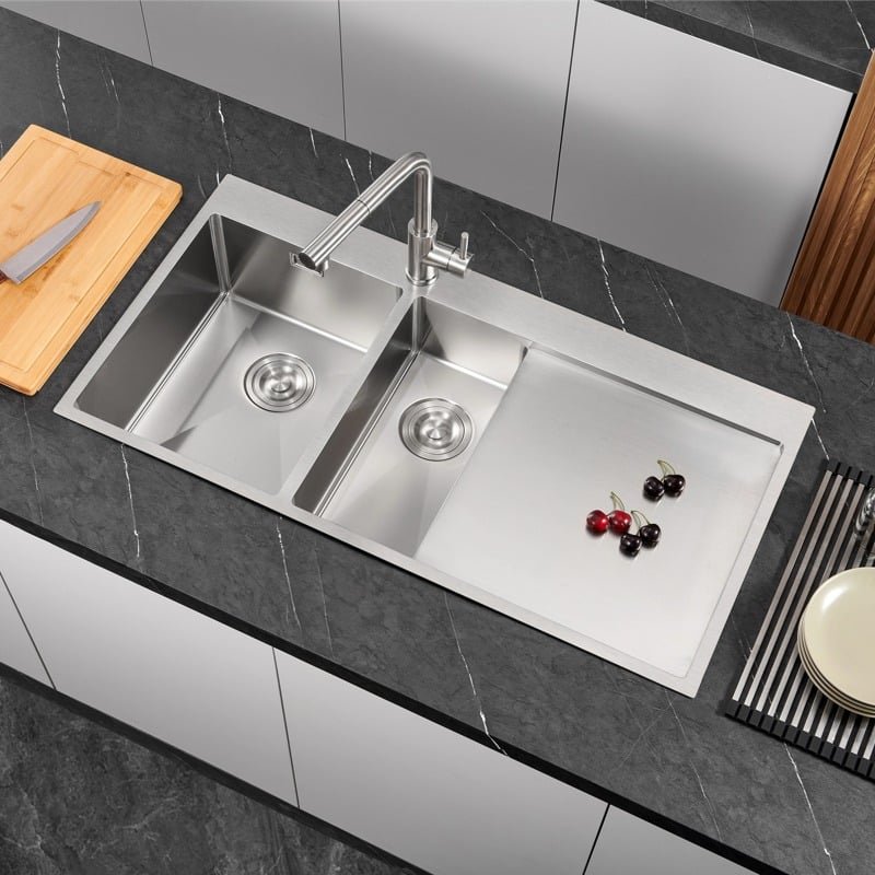 - Drainboard: The integrated stainless steel drying area channels water back into the bowls, protecting your benchtop from water damage and mold.