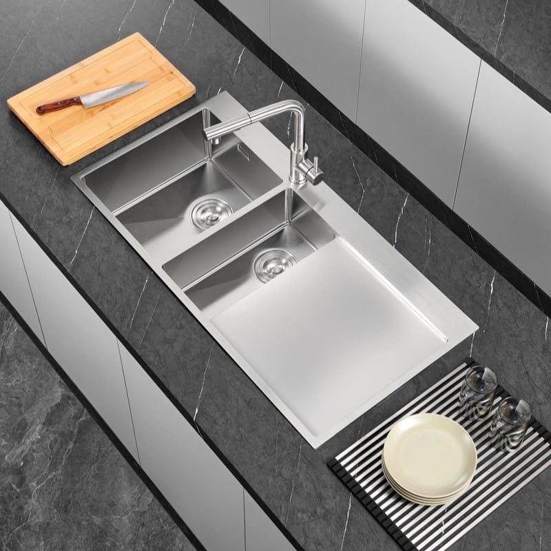 Crafted from premium 1.2mm (18-gauge) SUS304 stainless steel, the bowls feature R10 Tight Radius corners. This modern rectangular geometry maximizes bowl volume compared to old-fashioned round sinks while remaining easy to wipe clean.
