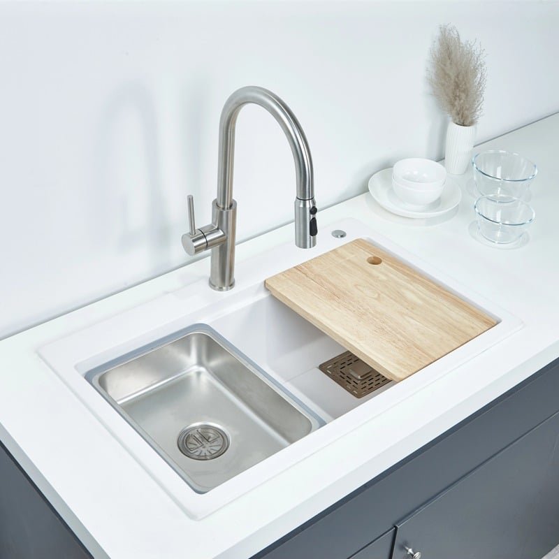 Constructed from a premium blend of 75% natural Quartz/Granite and 25% Acrylic Resin, this compact sink is built to survive the toughest environments. It is highly resistant to impact, chipping, and scratches from heavy cookware. Plus, it offers outstanding thermal shock protection, effortlessly withstanding extreme heat up to 200°C without warping or cracking.